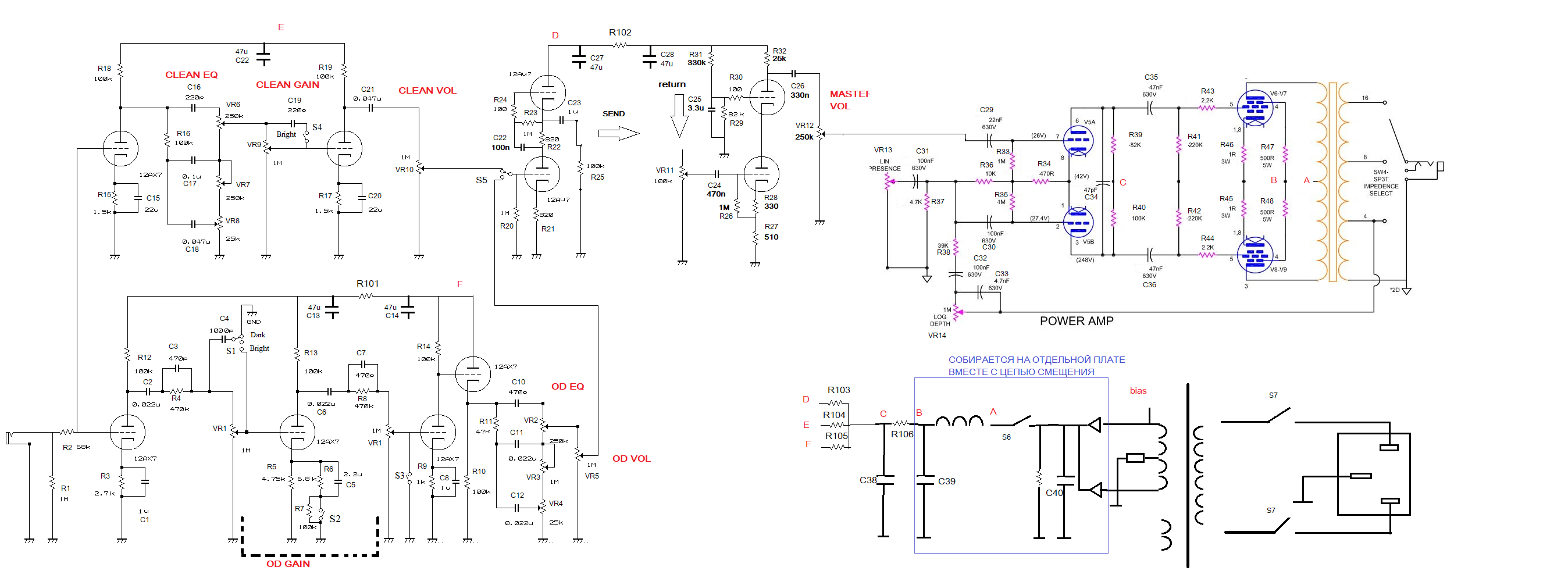 Входной каскад. Можем либо на половинках первой лампы сделать входной каскад первого и второго канала. Либо на одном баллоне собрать первый и второй каскад овердрайв канала, а под чистый канал выделить отдельный баллон.