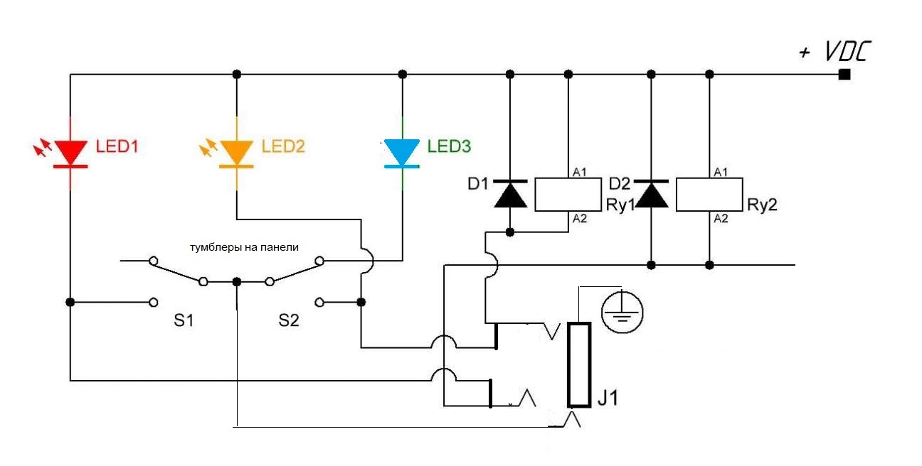 Вот отсюда я стартовал. Тоесть, когда футконтроллер не подключен, все лапки разьема соединены между собой. Земля на тумблеры лицевой панели и зЕмли для реле. Когда все реле выключены - у нас горит только синий диод.
