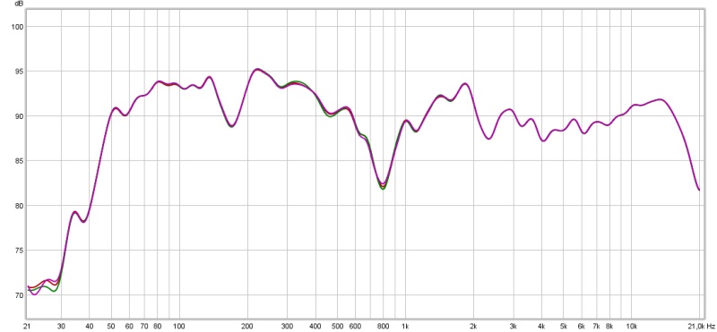 Измерял с расстояния в 50 см. Графики не самы линейные, я не выдерживал условия по установки акустики так, чтобы исключить отражения и прочие моды. Но нам это не важно, наша основная задача сравнить измерения в равных условиях. А именно одно и то же положение микрофона относительно акустики и уровень громкости. Для начала я провел несколько замеров связки ноутбук - ресивер - акустика. Почему несколько? Да чтобы убедится в неком постоянстве замеров. Я привел 2 графика на рисунке 1. Можно больше, но будет каша. Далее я включил иную связку.