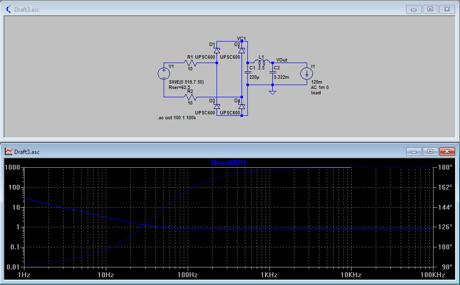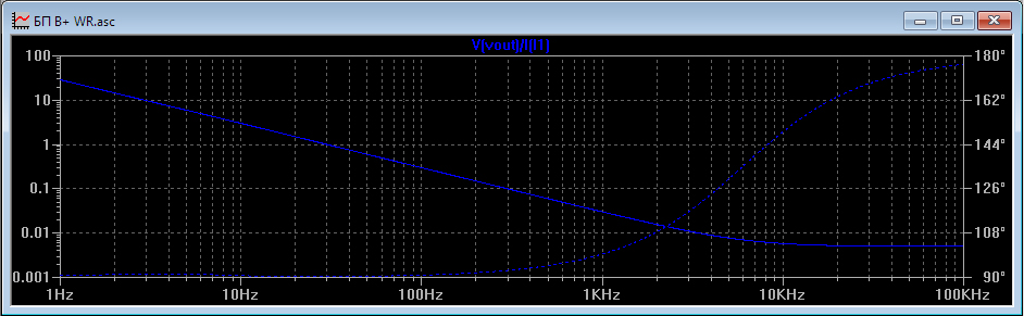По результатам этого моделирования пульсации уменьшились при исключении резисторов с ~15мВ до ~11мВ. Ничего особо исключительного. Но вот что показывает выходной импеданс: