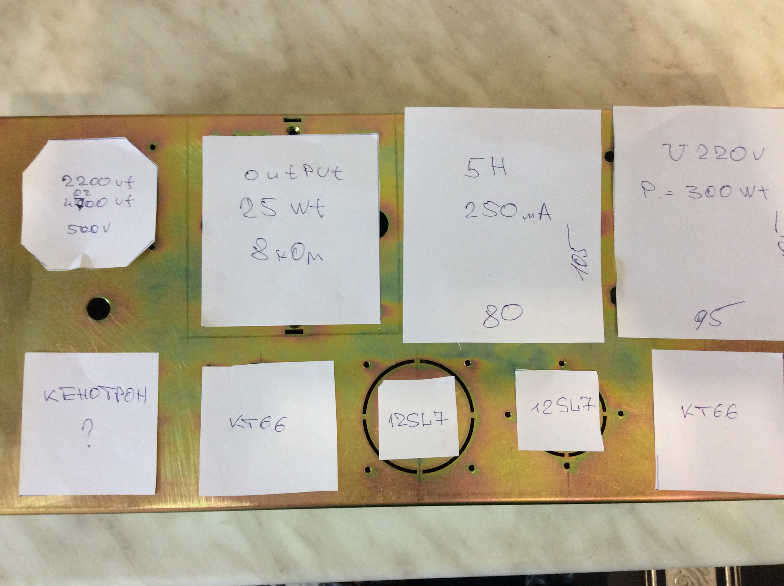 Контрольный выстрел, очередной, в свете всех изменений. Колебания относительно конденсатора и кенотрона. По дизайну лампы в ряд логично. А по разводке проводов, сзади по стеночке от силовика по прямой короче и кенотрон сзади, а конденсатор впереди. Ну а 4 звуковых ламп в ряд совсем логично, но можно их сдвинуть влево, а кенотрон крайний справа. Так правильнее: силовик, тут же кенотрон и конденсатор. Не хочется терять уже готовое маленькое отверстие под 12SL7. Сомнения терзают.