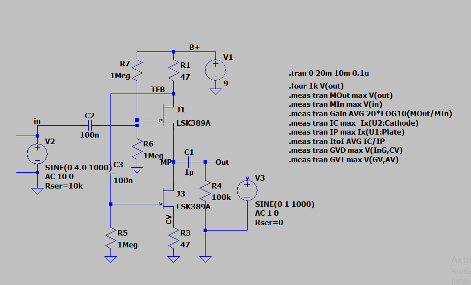 Я имел в виду другое. Вы добивались уменьшения КНИ, а я говорил об увеличении нагрузочной способности и выходного импеданса. Я не нашёл того варианта схемы, что Вы прислали на предыдущей странице обсуждений, времени моделировать пока нет, но вижу, что Вы используете измерители .meas, среди которых имеются IC, IP и ItoI. Если они остались от моих .op команд, то они означают амплитуду переменного тока в верхнем, нижнем JFET и соотношение этих амплитуд. Оптимальное соотношение, при одинаковых JFET сверху и снизу - 1. При таком соотношении выходной импеданс будет самым низким и отдаваемый в нагрузку ток - самым высоким.