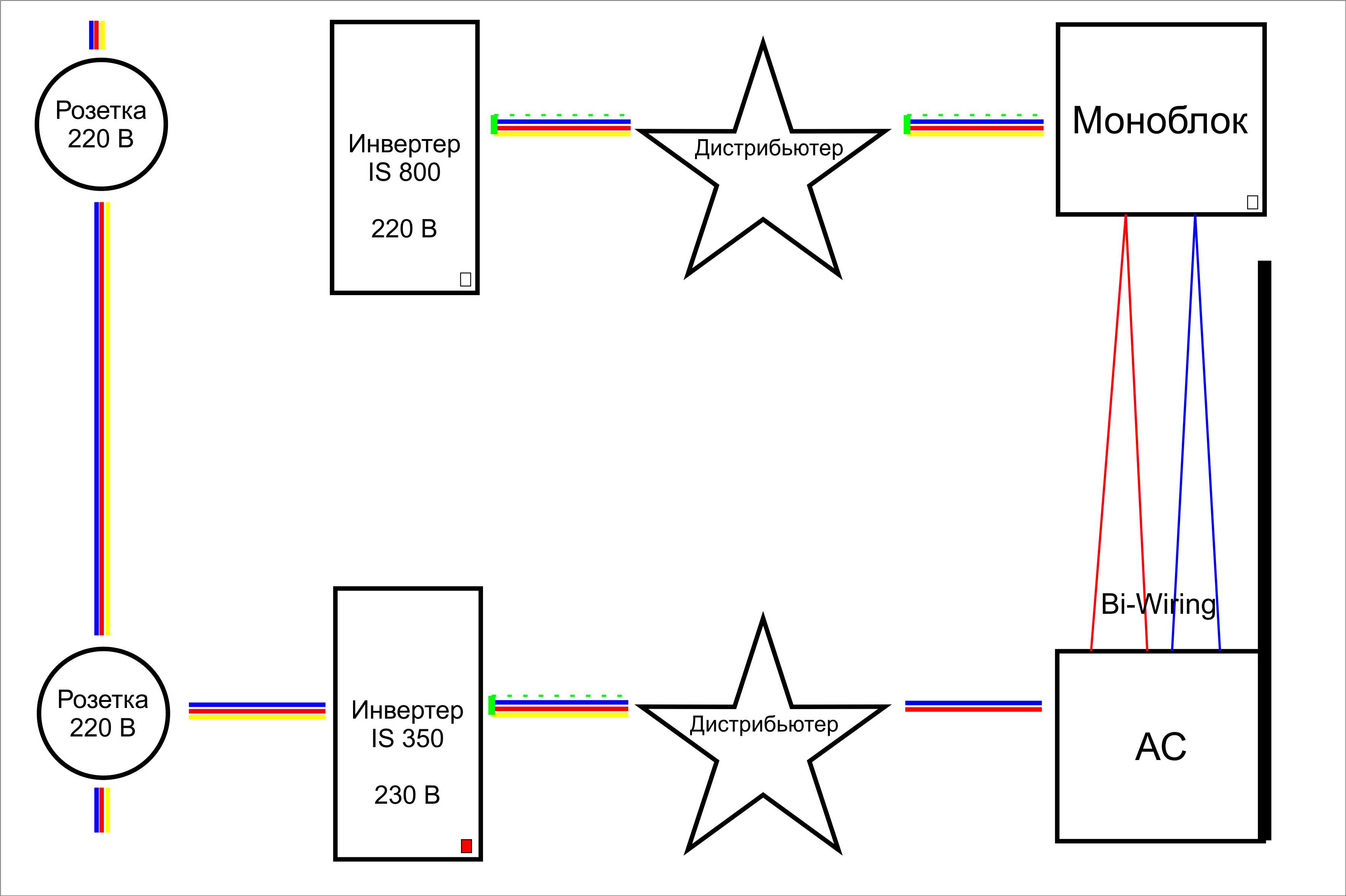 - п.2 это задуманная схема питания (самая верхняя картинка), такой фон наблюдаю, когда к АС подключен усилитель и все активированно. Т.е. включены только АС и усилитель, без других аудиокомпонентов;