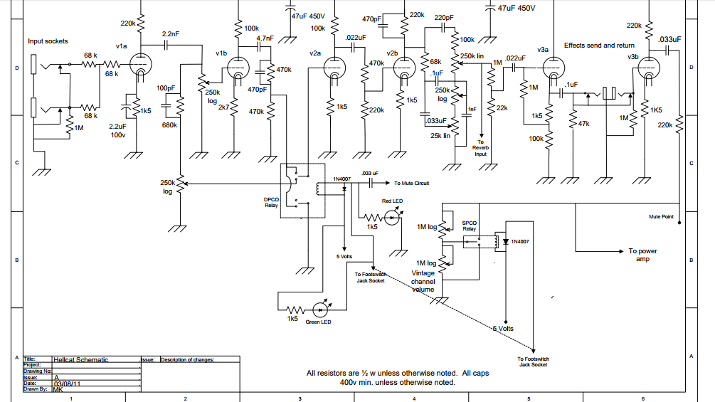 Здесь мы мало что экономим. Send-Return отсутствует - это минус две лампы из нашего дизайна. Драйвер не нарисован - это плюс 1 лампа к нарисованному. Итого получается 3,5 лампы (у нас - 4, и то, только потому, что наш Clean сделан на целой лампе, а здесь - на половинке). Переключение осуществляется 1 реле + JFET + Mute. У нас - парой реле.