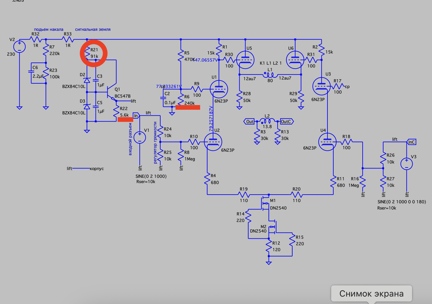 Перенес in на сетки ламп (мы же считаем усиление самой схемы - сколько пришло и сколько вышло) - и вот оно! Гейн получился 10. Это с учетом того, что выходной трансформатор сконфигурирован 2к1 Получается до трансформатора там еще усиление больше.