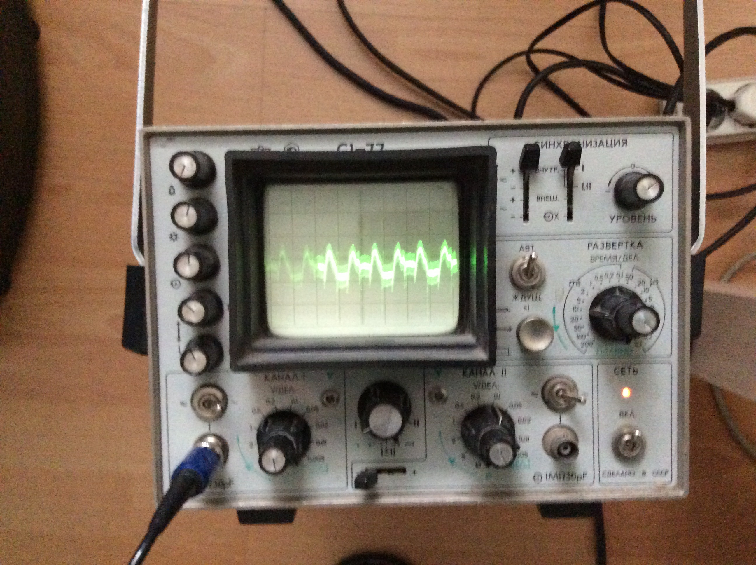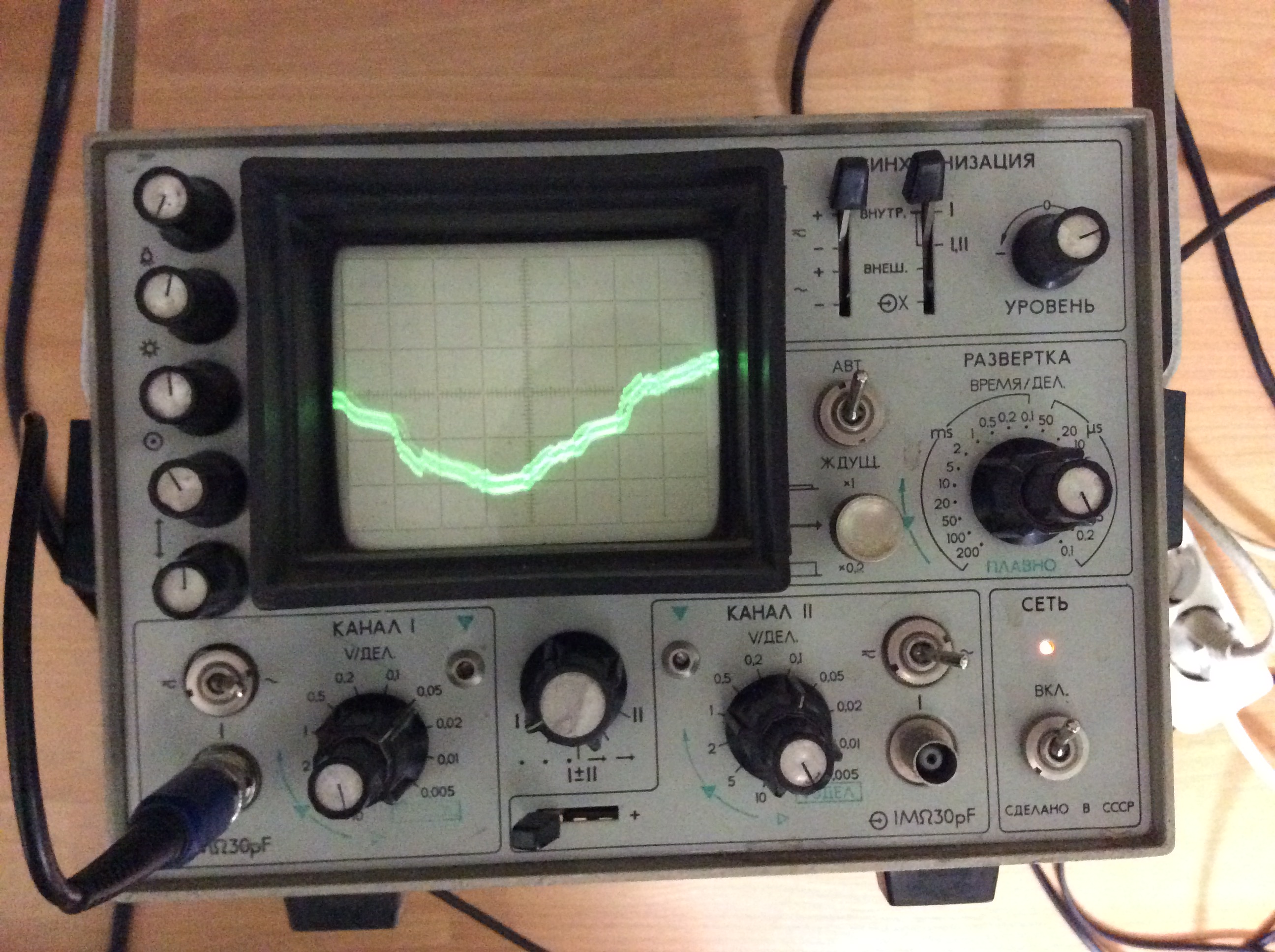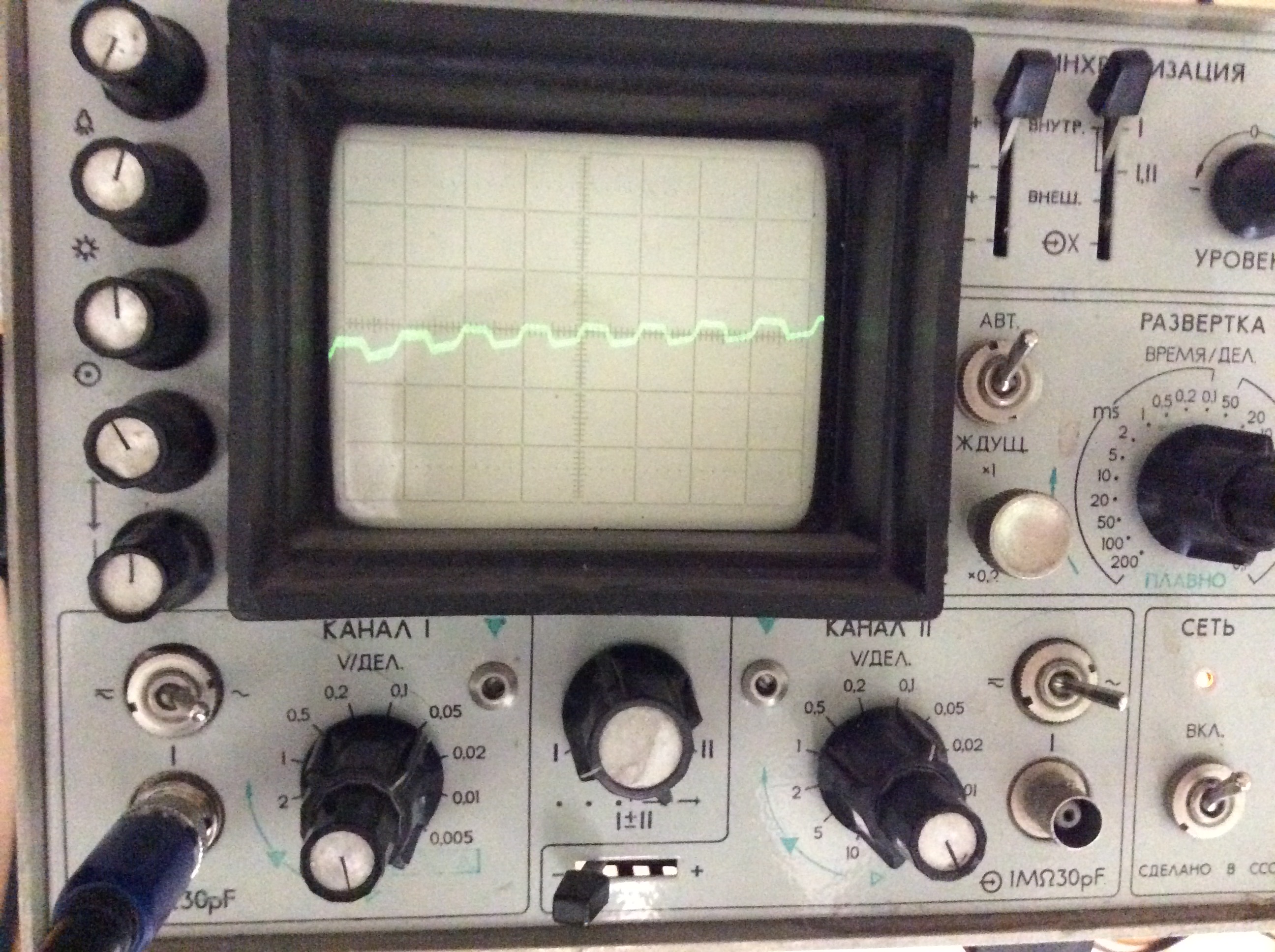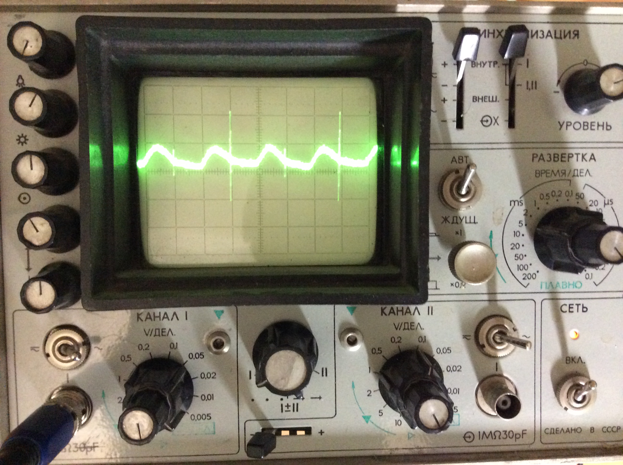 ещё раз: если цепляюсь за плюс/ минус самого накала 6,3 В почти идеальная прямая. А такой синус, если берусь земляным щупом за сигнальную землю. Надо удлинить земляной щуп и до тянуться до анодной земли питания.