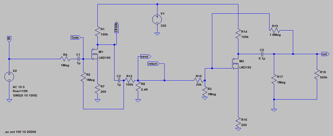 3. Устанавливаем между send и землёй источник переменного напряжения с нулевым внутренним сопротивлением и допустимой для каскада выходной амплитудой AC. DC=0.