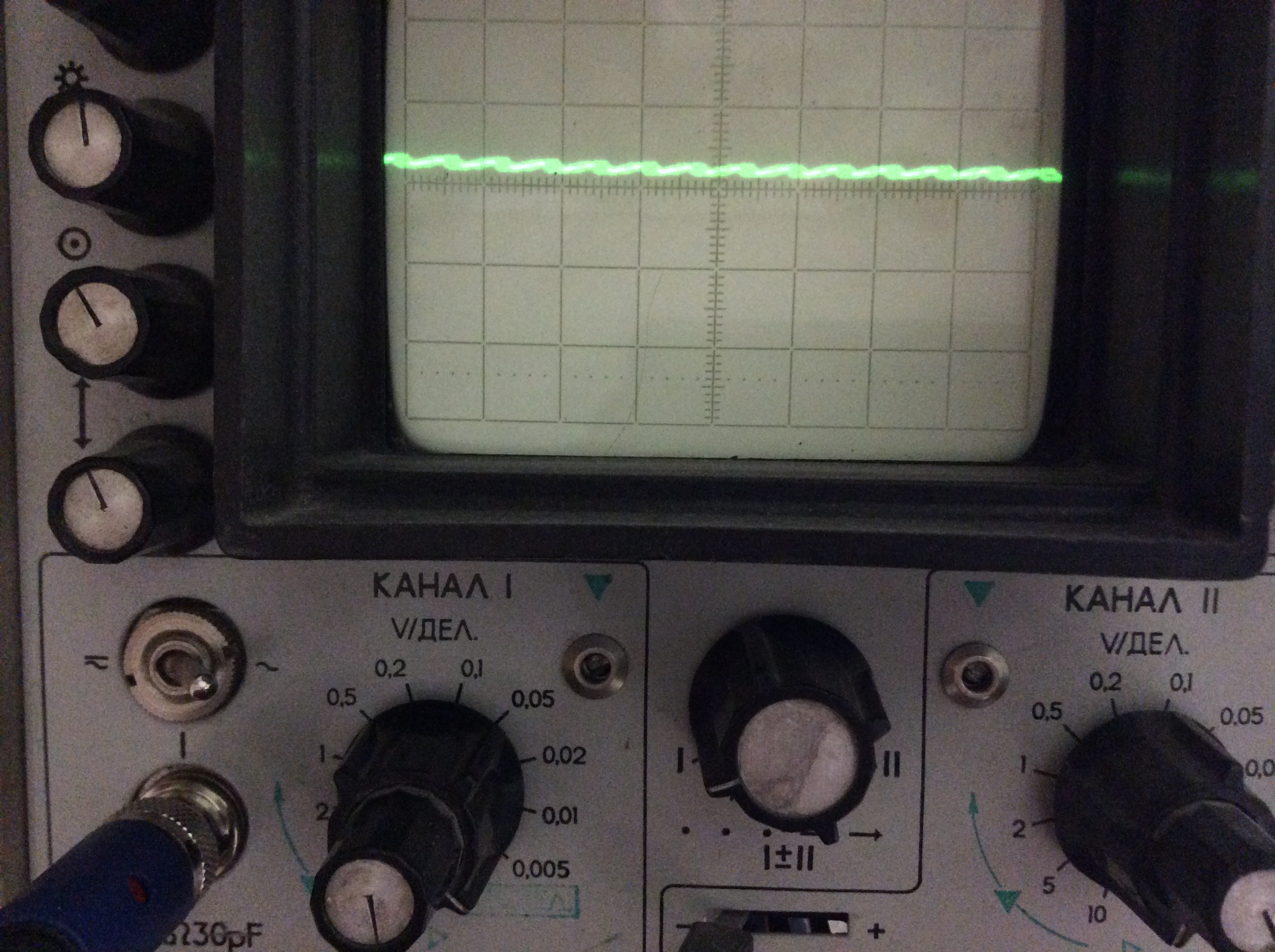 Решил поглядеть кино. Подключил осциллограф. По канально картинка одинаковая, около 1 мВ пульсаций. Осциллограф С1-77 стоит на минимальной цифре и максимальной чувствительности 5 мВ/ дел. И 2 ms частота. Прошёл по частотам вверх до конца ( 10 МГц по паспорту), ничего особливого не узрел.