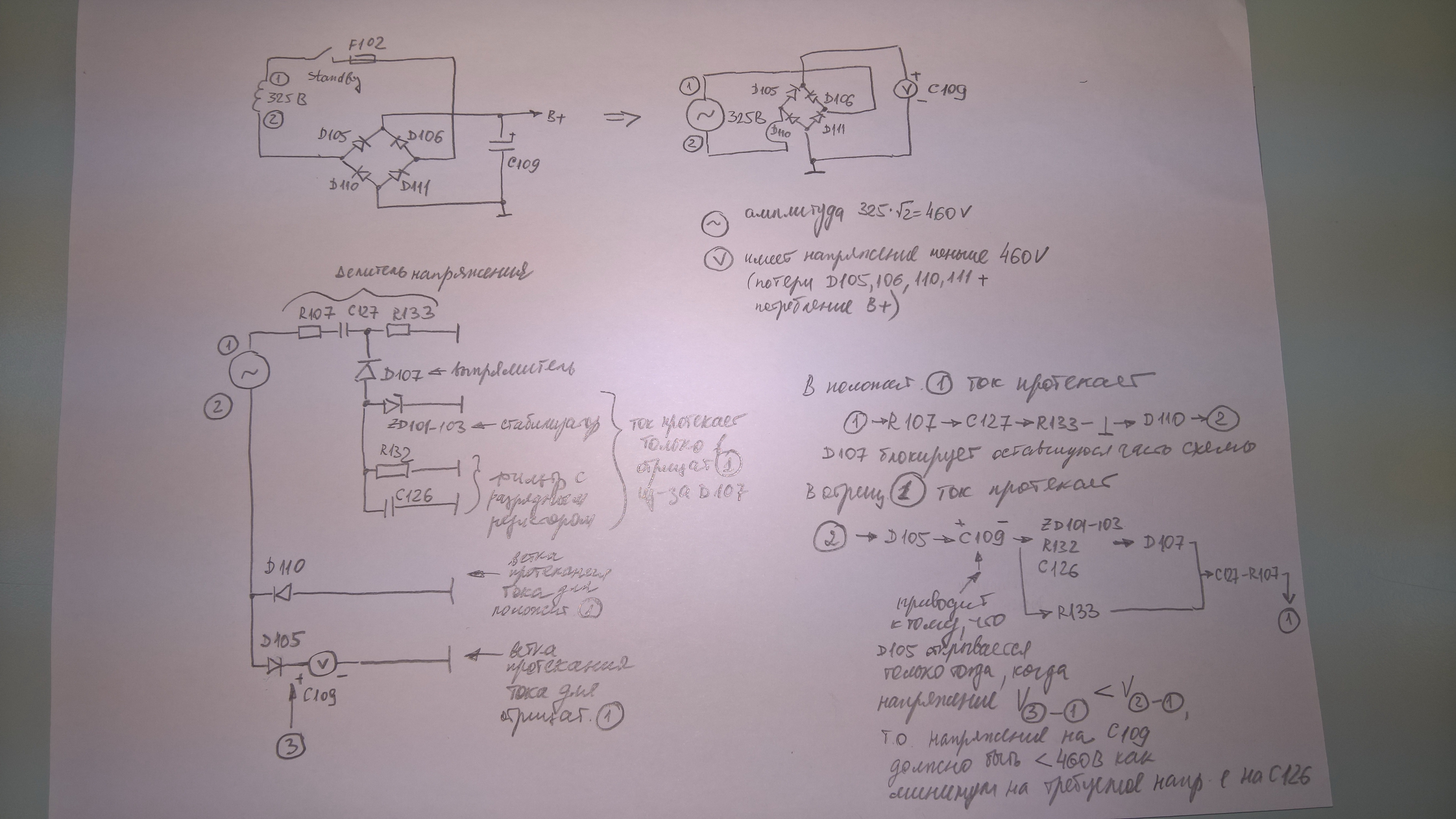 Здесь нет полной схемы соединений. К примеру, нижняя шина выпрямителя на D107 (положительная) вообще непонятно куда идёт.