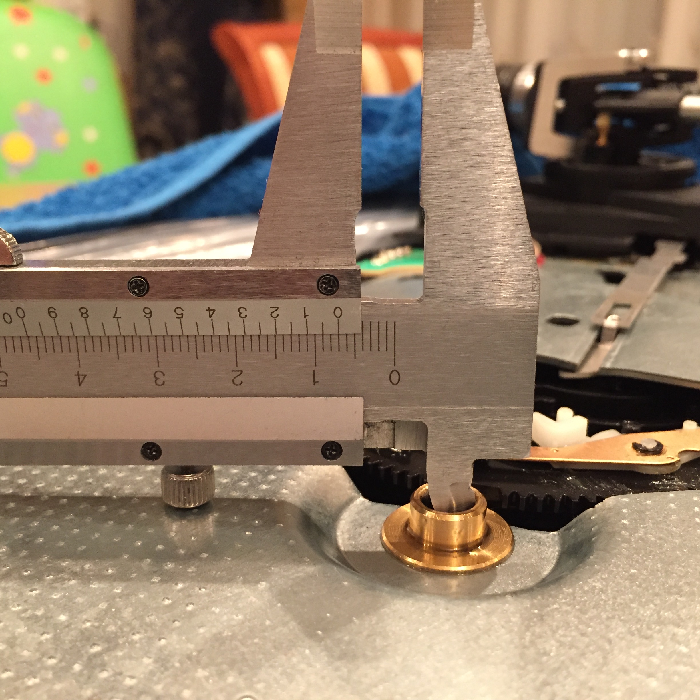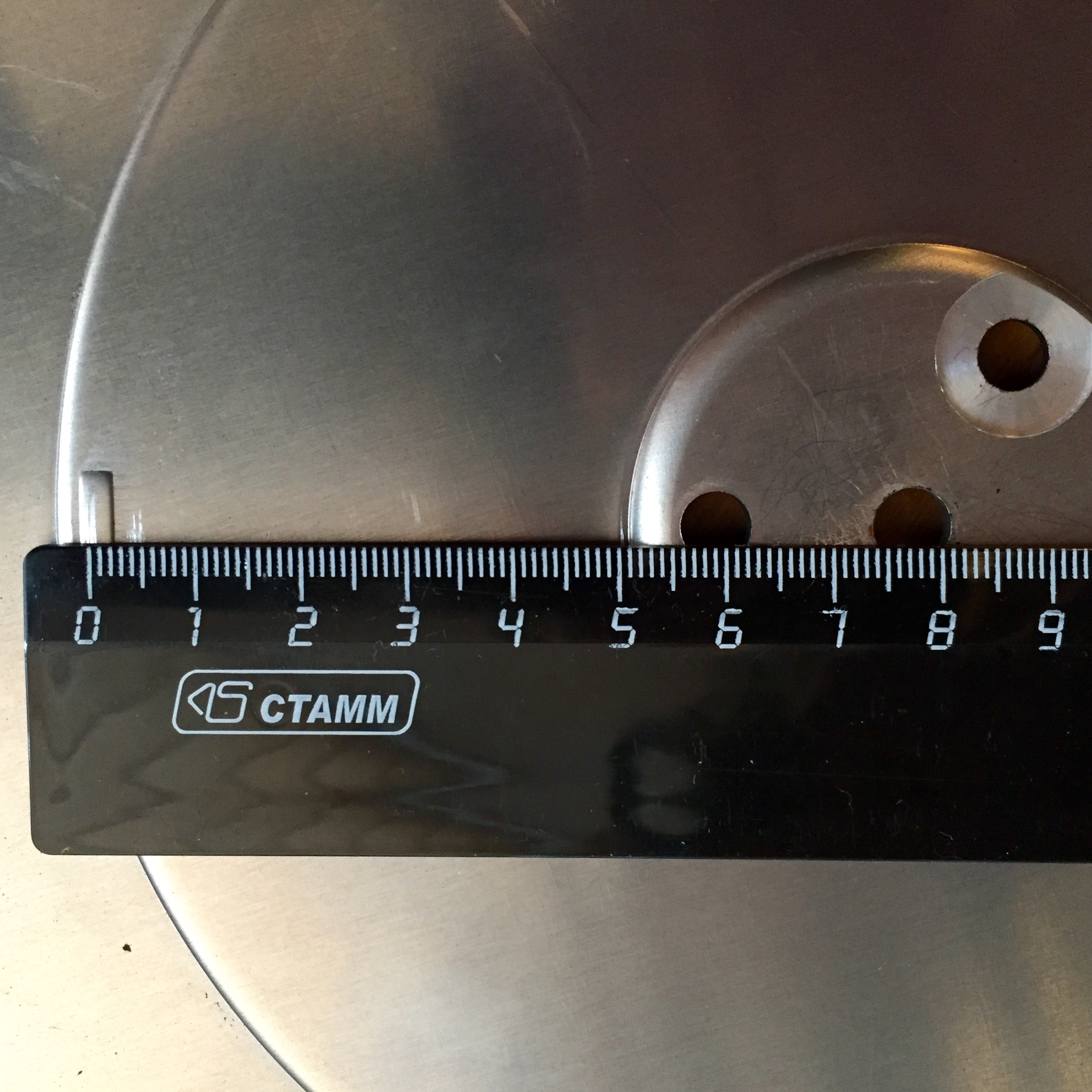 Я измерил выступание бортика над центром диска привода (3,5 мм.). И зазор между центральной частью поворотного диска и этими выступами (2 мм.). Очевидно, что диск привода можно уменьшать до 1,5 мм. Если учесть измеренное биение, этого хватит с запасом.