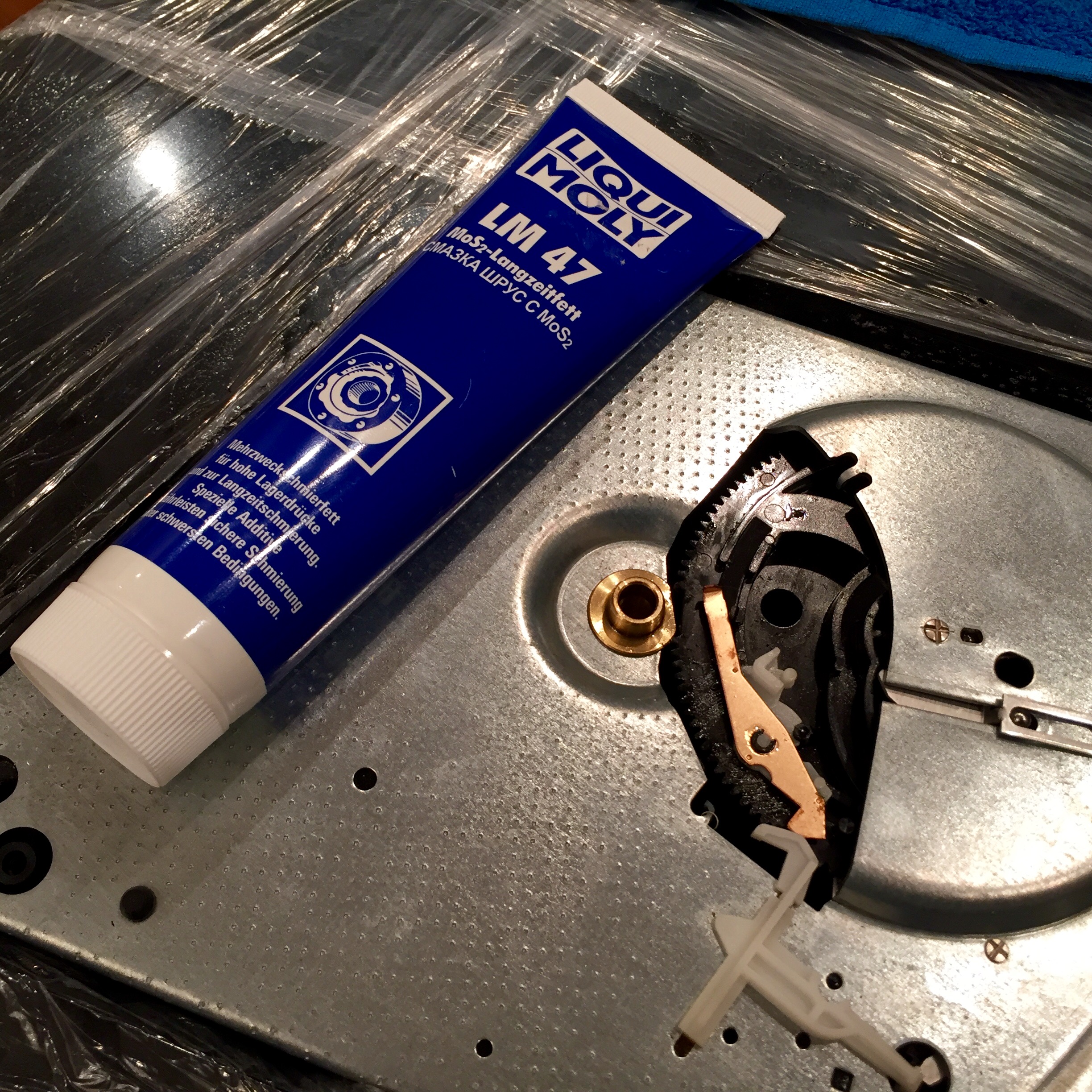 Для того, чтобы смазка распределилась, поставил на шток вес (из двух прижимов) и вкючил на скорости 78.
