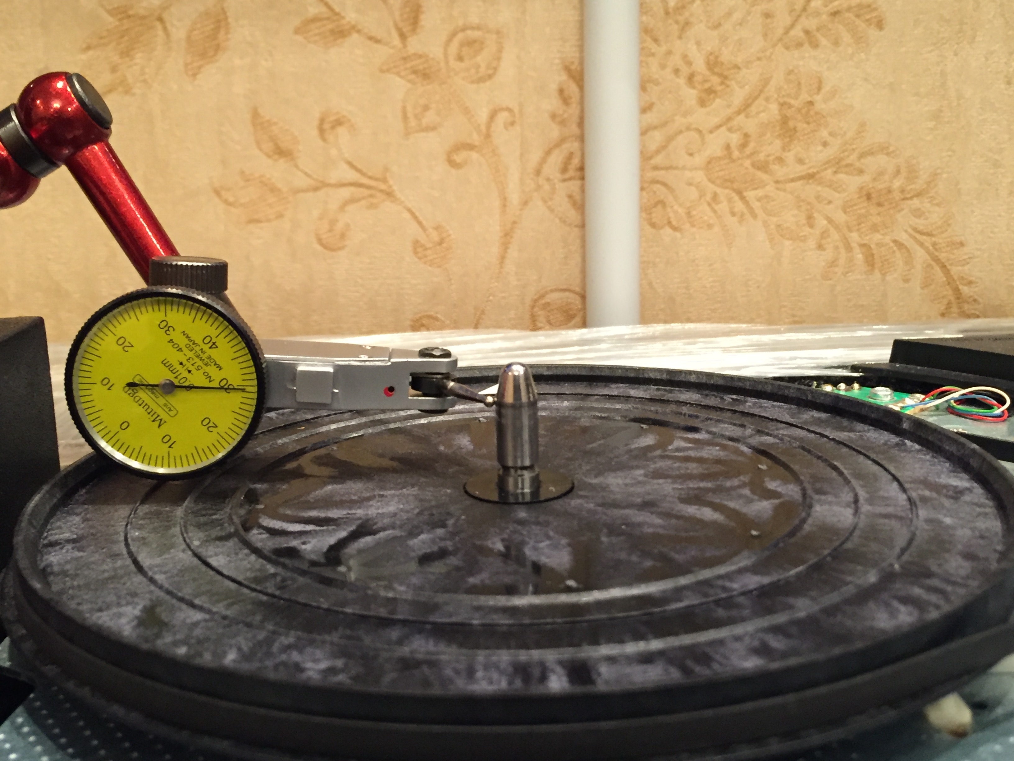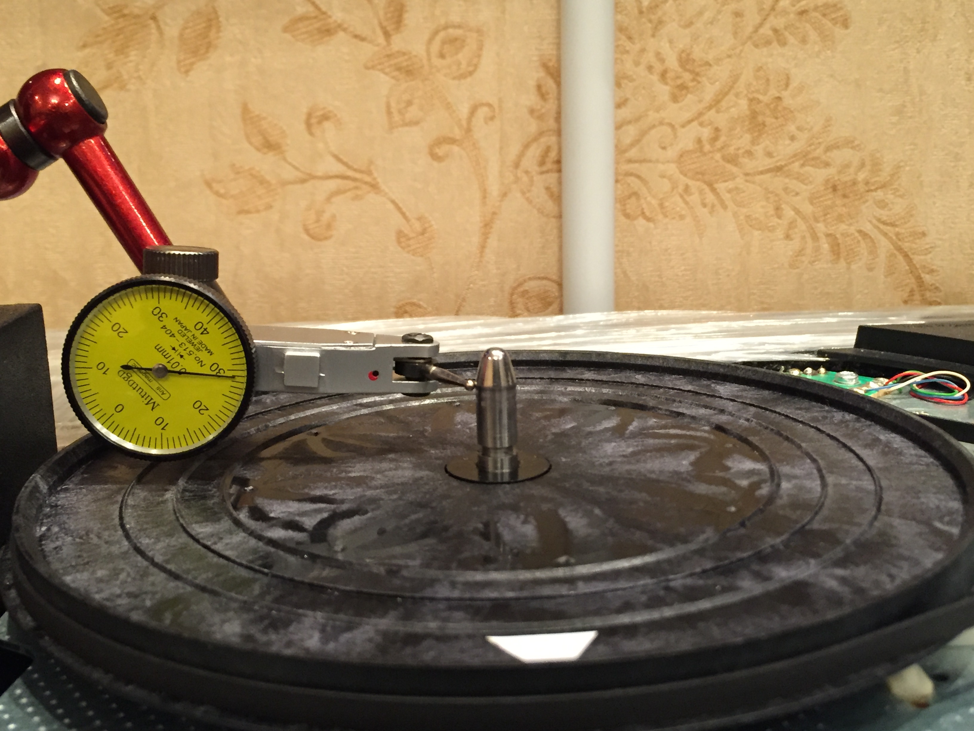 P.S.#4 Щуп измерителя имеет небольшую упругость. Это вносит погрешность в измеряемое отклонение. К тому же, я имею поворотный диск, который не закреплен жестко на приводе. И пассик, от натяжения которого зависит проявление люфта. Дабы как-то повысить чистоту эксперимента, я убрал поворотный диск. Измерения стал проводить непосредственно на диске привода.