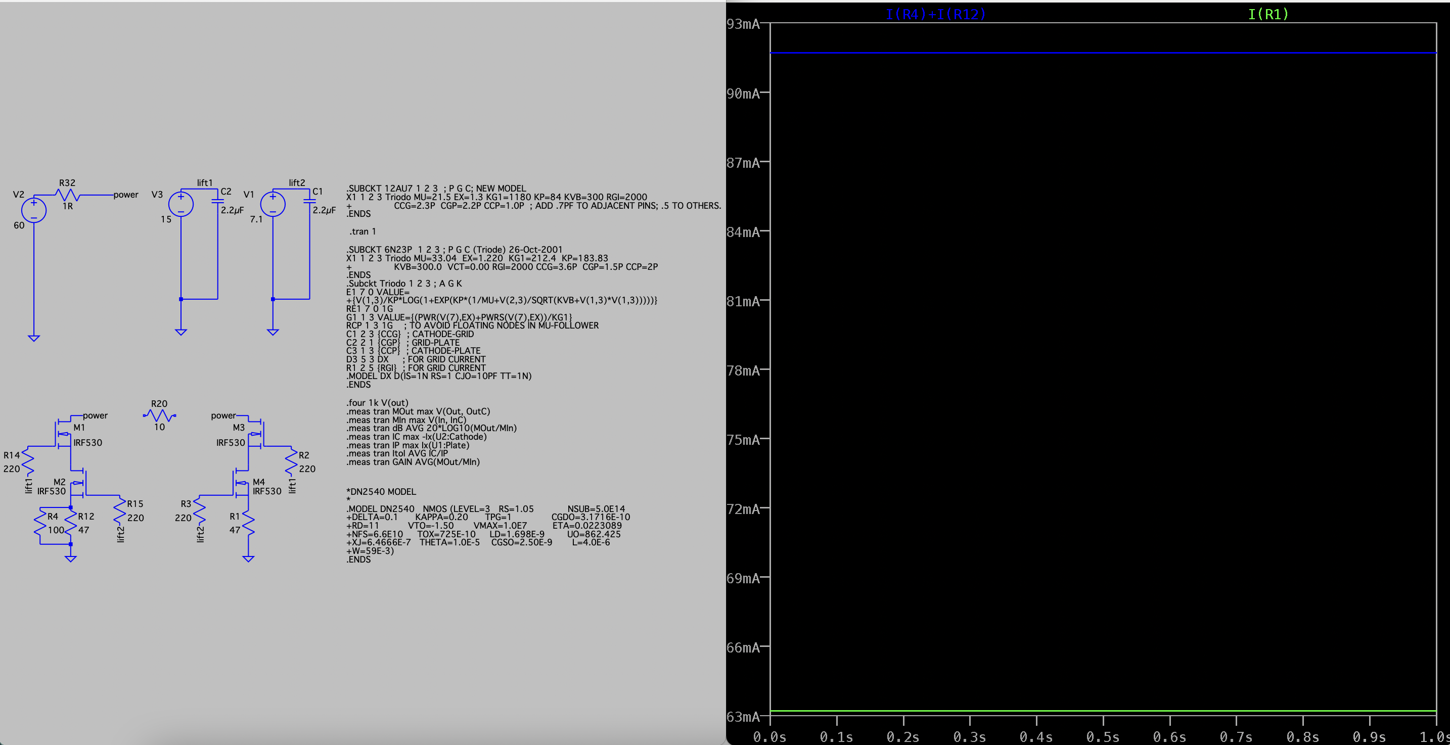 Я провел моделирование с irf530 и 510, результаты по току очень близкие - расхождения в доли миллиампера. У меня вопрос такой - я понимаю, что мы прикладываем потенциал к нижнему транзистору, в хвосте которого резистор, на нем происходит падение напряжения... соотвественно имеем GS напряжение задающее ток.
