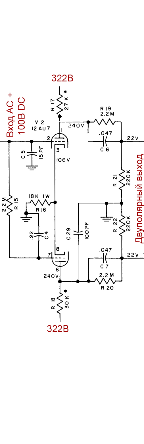 Как мы видим, на катоде нижней лампы напряжение 11В, по оригинальной схеме усилителя накал заземлён (напряжение =0). Для нижней лампы никаких проблем пока не наблюдается. А вот на катоде верхней лампы - 236В, что превышает допустимые 200В. Для того, чтобы исключить пробой, нам нужно "оторвать" накал от земли и подать на него простейшим делителем напряжения, например, +100В. Т.о., для нижней лампы накал окажется более положительным (это улучшит также показатели шумов), напряжение накал-катод будет 89В постоянного и до 130В переменного тока. Оба параметра - в норме. Для верхней лампы это будет -136В постоянного тока и до - 176В переменного. Тоже всё в норме.