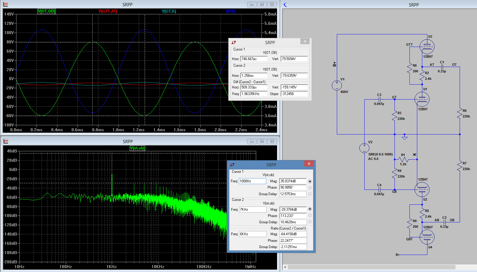 Общие замечания. Номиналы всех пассивных деталей входных и выходных цепей взяты из оригинальной схемы. Я позволил себе лишь увеличить выходные конденсаторы с 0,22мкФ до 0,33мкФ, поскольку нагрузкой для каскадов будет являться не резистор 1М, как по схеме, а резистор 220к, что является максимальным значением для сеточных резисторов применяемых в выходном каскаде мощных ламп. В реальности, просто необходимо увеличить входные конденсаторы хотя бы до 0,33мкФ, а выходные - примерно до 0,47 - 1 мкФ. Как правило, на эпюрах напряжений в левой верхней части вставленных рисунков отражены напряжения сетка-катод (чтобы быть уверенными, что они не выходят в положительную область), ток анода (на одном из анодных сопротивлений - чтобы исключить клиппирование и выход тока за пределы максимально допустимого), выходное напряжение. В левом нижнем углу показано быстрое преобразование Фурье, для оценки чистоты спектра. КНИ я определял по доминирующей гармонике, однако, нужно смотреть и на амплитуду других сравнимых гармоник, чтобы однозначно определить выигрышную с точки зрения нелинейных искажений конфигурацию. Также нужно учитывать, что выходной каскад на лампах, при максимальной выходной мощности, будет иметь КНИ в единицы процентов, поэтому, хоть показатели КНИ драйверного каскада всё равно важны, к ним стоит подходить критически.