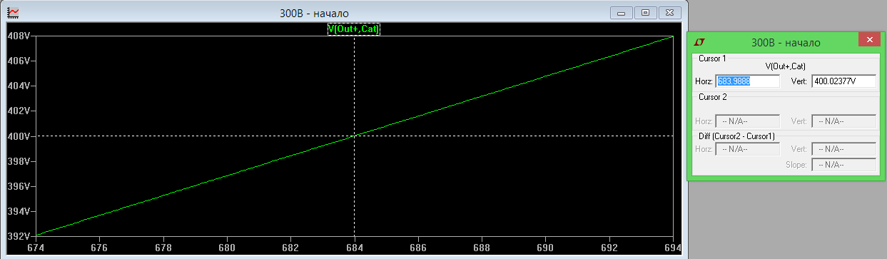 Т.о., напряжение питания будет равно 684В. Его и можно будет записать в значение V1. В общем случае такого простого решения ожидать не приходится. Поэтому я собираюсь продемонстрировать одно из полезных средств в LTSPice - подбор параметров. Он осуществляется командой .step, помощь по которой можно получить во встроенной документации. В нашем случае эта команда будет выглядеть так: