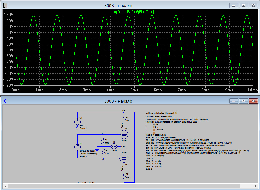 К сожалению, никаких данных по ограничениям по току и по максимальному напряжению для ламп 300B я не обнаружил, поэтому проверять придётся на практике. Успокаивает то, что режим с Va=350В, Ia=80мА на сравнимую нагрузку 2,2к существует в таблице в файле 300a_b - we.pdf, выложенном ранее в ветке. Кроме того, у нас есть запас по напряжению, току и рассеиваемой мощности.