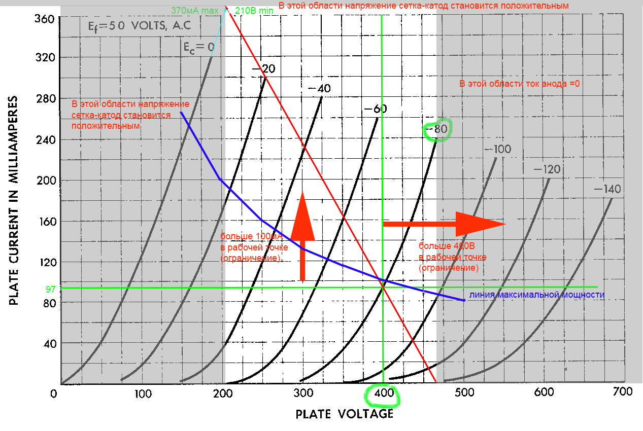 - напряжение смещения (катод-земля): его можно определить из той же таблицы, откуда мы взяли параметры нашей рабочей точки (400В@80мА) =-84В.