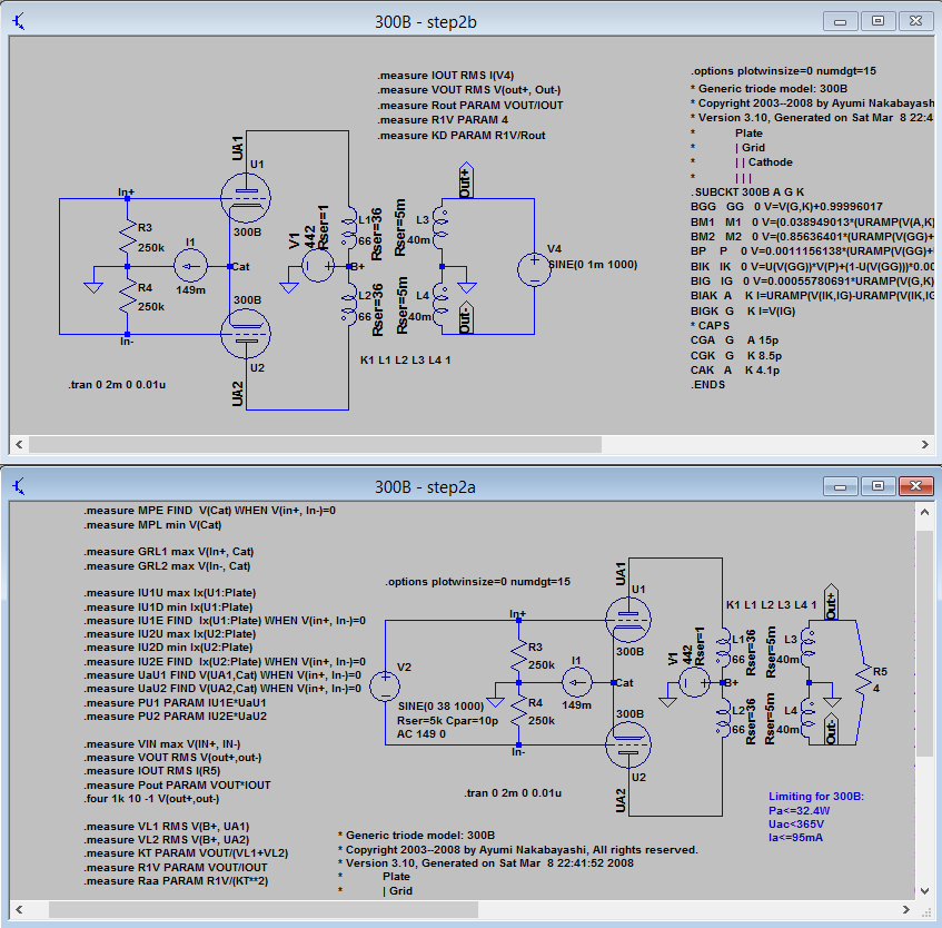 Для упрощения расчётов я разбил схему на два варианта. В версии 2а я буду исследовать усилительные свойства каскада, в версии 2b - коэффициент демпфирования. Получившиеся изменения приведены ниже: С помощью этих моделей я просчитал работу усилителя с трансформатором (импеданс Rаа первичной обмотки) 3,5к, 4к, 4,5к, 5к, 5,5к, 6к, 6,6к для трёх сценариев: