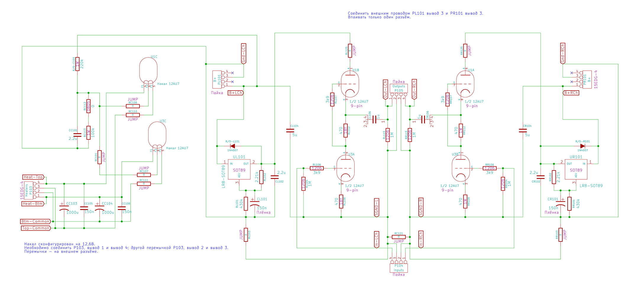 Так как плату будем питать от одного БП, то две стороны платы объединяем. На плате будет пара плёночных конденсаторов (которые можно заменить на "последний 100uF") пара LR8 с обвязкой и выходным конденсатором и подъём накала.