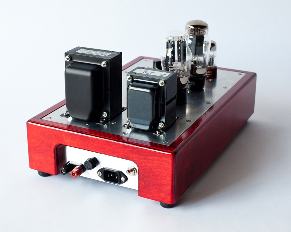 Здесь пока нет декоративной фронтальной панели. Она изменит внешний вид очень значительно. Пока не нравится излишняя массивность моноблока. Я был вынужден увеличить высоту до размера корпуса предусилителя и фонокорректора. Накладка поднята аж на 17 мм. Это дает приток воздуха под кожухи трансформаторов и к лампам с низу, но делает весь корпус неуклюжим.