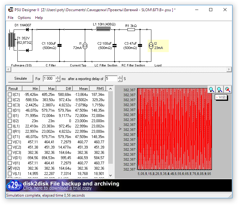Я представил сопротивление в цепях фильтрации как одно значение (R62+R16)//R19//(R23+R36). Емкости просуммировал просто. Порядок напряжений получил искомый 380В. Считал для другого трансформатора. Поэтому прошу проверить корректность занесенных данных, тогда смогу пересчитать под "наш" трансформатор, точнее, морально позволю себе продолжить