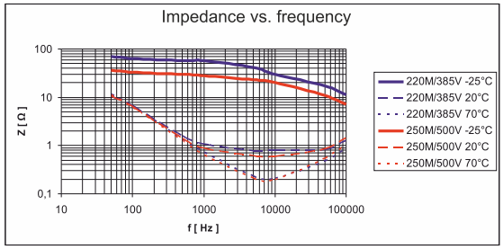 Мы используем не импеданс, а ESR (или tgδ с пересчетом). Это - разные вещи. Импеданс, приведенный на графике - это полное сопротивление конденсатора переменному току на разных частотах (т.е., с учётом ёмкости самого конденсатора). PSUD - вещь грубая, она учитывает только частоты сети и максимум удвоенные от неё. Т.е. любое значение ESR для частот равных или больше 50-100Гц для нашей страны будет правильным.