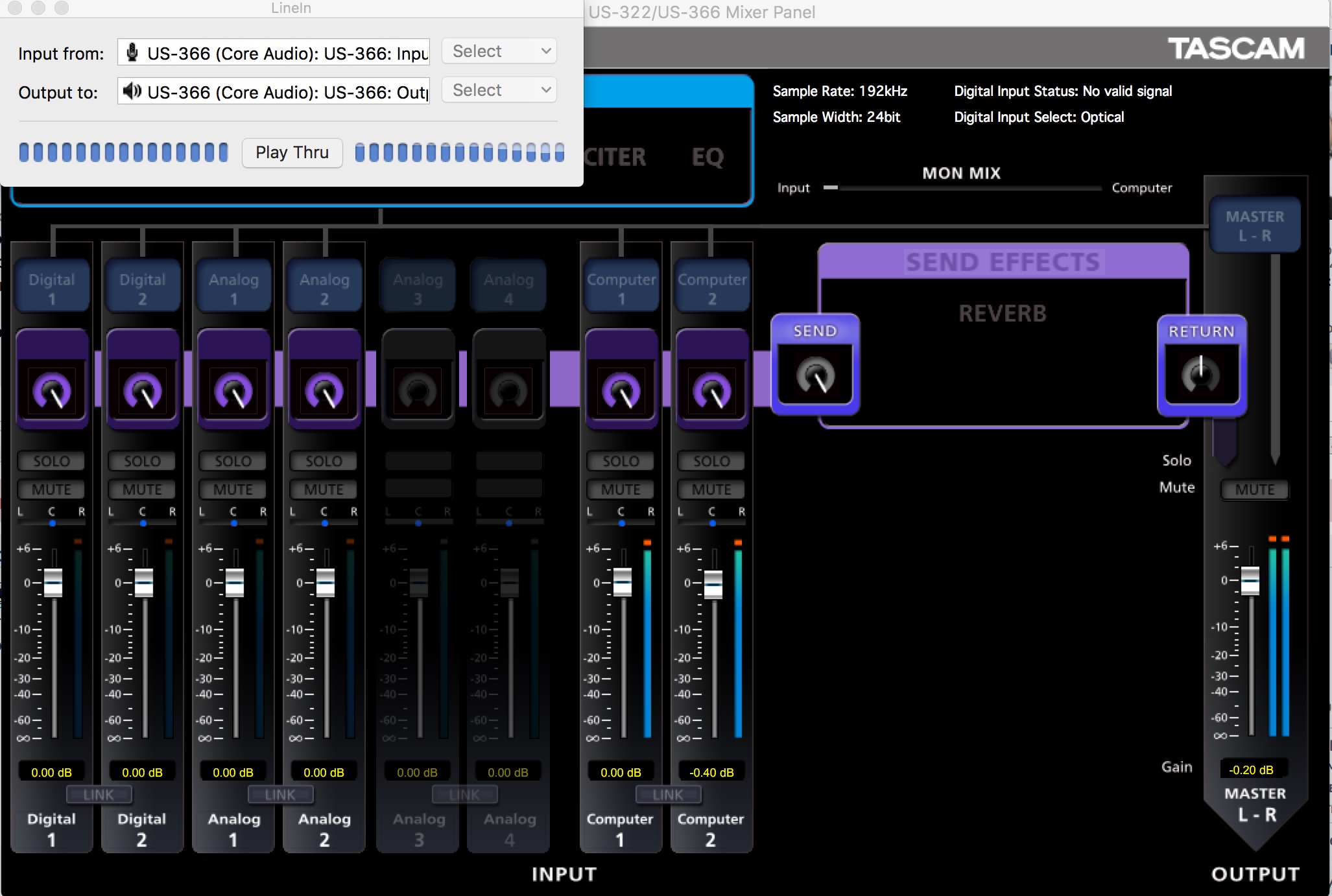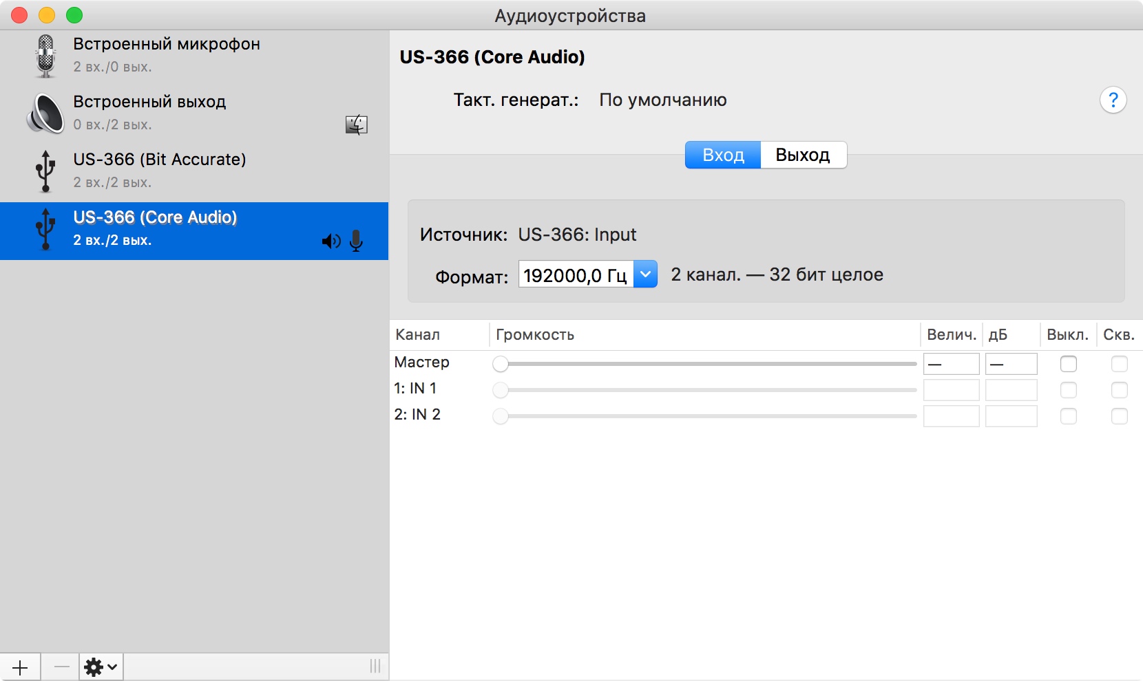 Ну, без дополнительных ухищрений звука нет. Хотя в системных настройках компьютере и вход, и выход - US-366. B и главное, они ведь видят сигнал, индикатор входа активен.