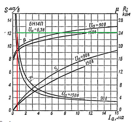 Я нашел значение для Ua150, но там линии настолько близки, что думаю, для нашего анодного мы будем в коридоре двадцати килоом, таким образом усиление будет 18-19.