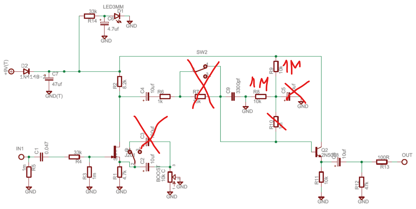 R1C2C3-BOOST - локальная ООС каскада на JFET Q1. В показанном положении переключателя - действует на широкую полосу частот с регулировкой BOOST. В другом положении - НЧ ослабляются постоянно, ВЧ - регулируются BOOST.
