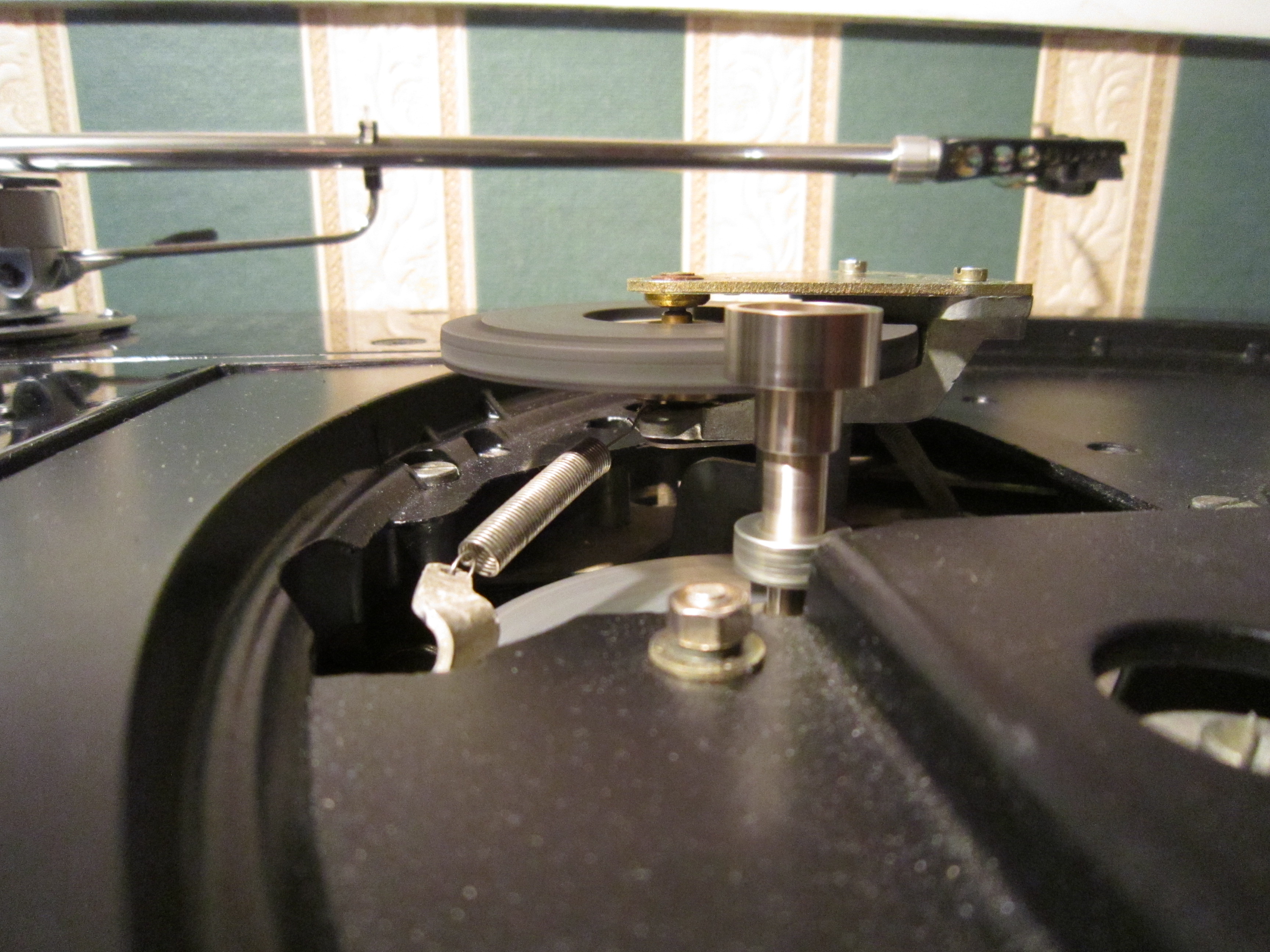 Блин, это меня конкретно разозлило!!! О таких вещах предупреждать нужно. Винты оказались без стопоров. Я пока крутил, один открутил совсем. Внизу железяка повисла и начала дребезжать. И вот я один, полпервого ночи, держа одной рукой тяжеленный проигрыватель, второй накручивал винт и удерживал пружинку...