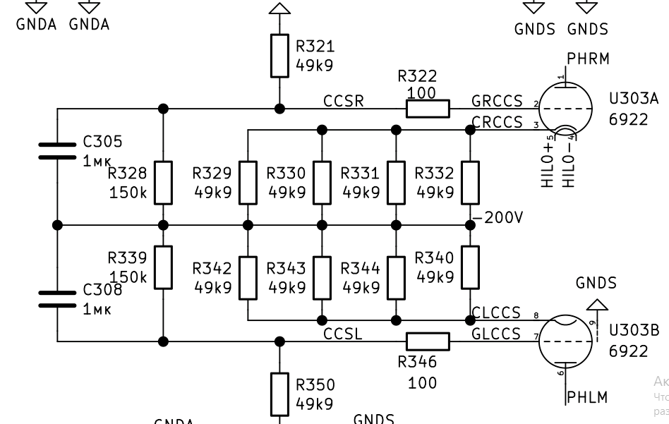 R321, R328 - делитель, даёт на точке CCSR -50В. Имея в виду, что напряжение сетка-катод у 6922 в номинальном режиме будет проценты от 200В, игнорируем его (несколько понижая точность вычислений), получаем ток источника тока 150В/(50кОм/4шт.)=12мА. Ra примерно 2,5кОм, усиление 33, Rk=12,5кОм, эквивалентный импеданс получается в районе 400кОм. Вполне пристойно.