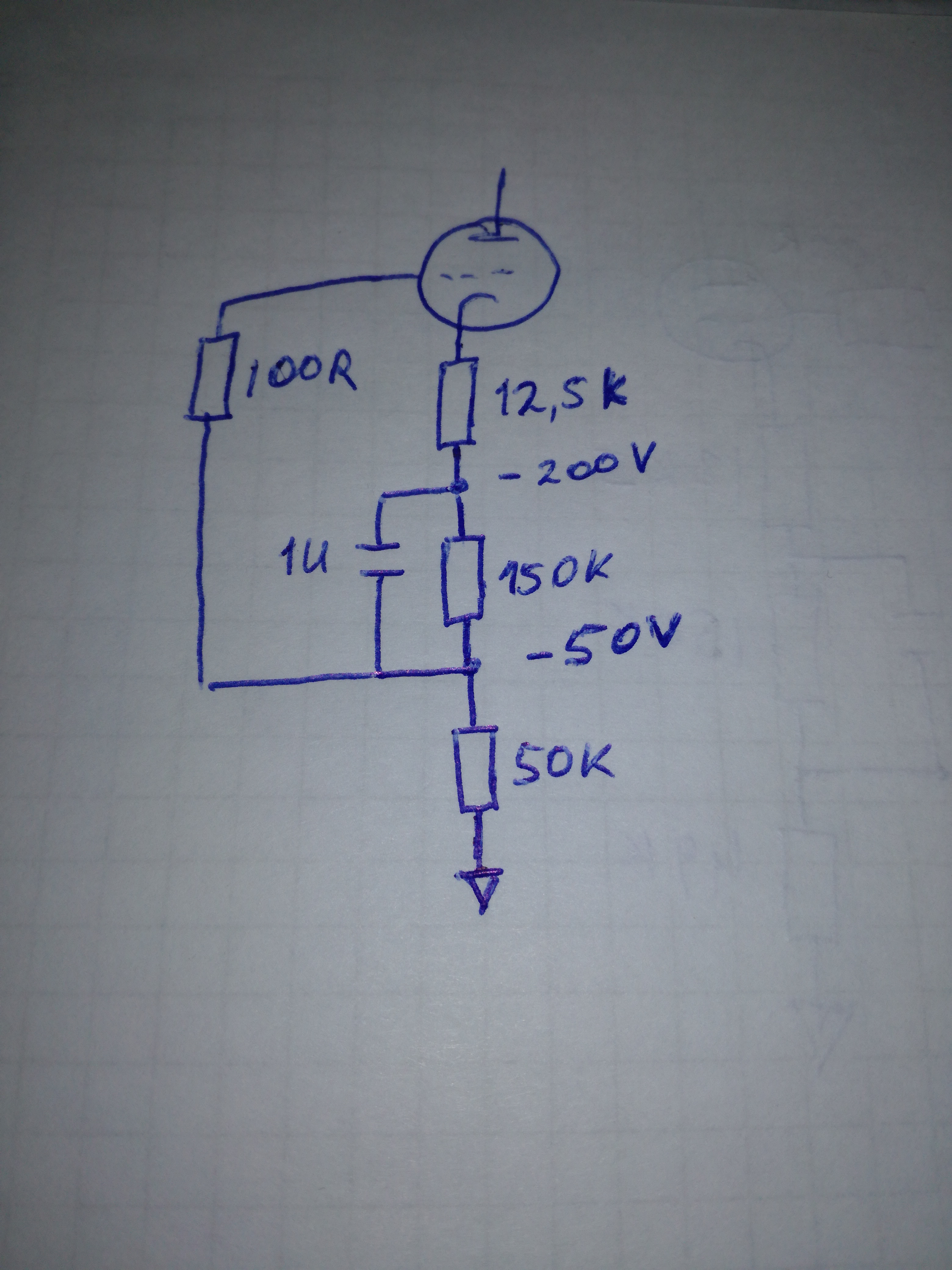 Для определения рабочей точки можно провести небольшие прикидки. Фактически, у нас каскад работает от напряжения 400В, имеем три реперных точки по напряжению: +200В, 0В (сигнальная земля) и -200В. Если ориентироваться на ток 6мА, получим, что на аноде верхней лампы каскода +50В. Сетка верхней лампы поднята над уровнем 0В на 7В, т.о., на катоде будет на 2-3В выше, т.е., для ровного счёта, 10В. Напряжение анод-катод на лампе будет 40В. В нижней части каскода работает транзистор (Q301). В связи с тем, что его база по постоянному току заземлена (потенциал =0В), для обеспечения его работы эмиттер должен иметь отрицательное напряжение, в данном случае оно составляет примерно 2-3В, кроме того, некоторое напряжение остаётся на резисторах обратной связи R310, R317. Т.о., на аноде лампы источника тока будет относительно реперной точки 0В примерно -3В. Если заземлить сетку этой лампы, то её потенциал будет выше потенциала анода. Для нормальной работы потенциал сетки относительно катода должен быть отрицательным, т.е., потенциал катода должен быть выше потенциала сетки. Фактически получаем, что лампа будет включена в обратной полярности и работать не будет. Чтобы этого избежать, мы подаём на сетку потенциал -50В. Получаем на аноде -3В, на сетке =-50В, на катоде ~-47В. По постоянному току всё ОК.
