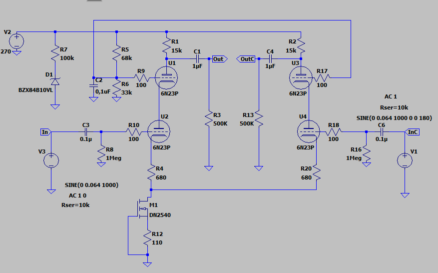 Принцип работы самобалансировки прост: все мы знаем, что резисторы в катоде SE работают как для динамической (рабочей) характеристики (если не зашунтированы), так и определяют статический режим работы (рабочую точку). Т.е. они определяют ток через лампу с достаточно большой точностью. Представим теперь, что ток у нас определяет источник тока в катоде, а не резистор. В этом случае каскад усиливать ничего не будет, потому что импеданс источника тока много больше импеданса нагрузки: это будет катодный повторитель. В балансном варианте напряжение сигнала на источнике тока изменит напряжение сетка-катод связанной половинки, что приведет к тому, что часть тока будет "добавляться" или "потребляться" через эту связанную половинку. При полной симметрии ламп и противофазном сигнале в половинках источник тока вообще не будет "видеть" распределение тока через половинки. От этой конфигурации один шаг до самобалансировки. Если оставить для каждой половинки "свой" источник тока и соединить катоды суммарным катодным сопротивлением обратной связи (R4+R20), то для DC-режима любая разность токов через половинки будет вызывать падение напряжения на соединяющем катоды сопротивлении, это напряжение, так же, как и для катодного сопротивления в SE будет заставлять лампу стабилизировать ток через неё.