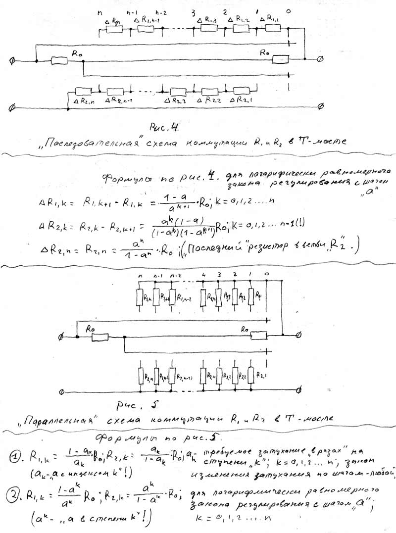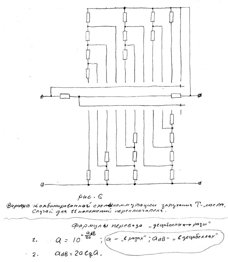 преимуществом этой схемы \нижняя на эскизе \ перед обычным аттенюатором в виде обычного переменного резистора (в виде последовательно соединенных резисторов) это меньшее количество паяных соединений и резисторов на пути прохождения сигнала ну и ранее указанное отсутствие обрыва при переключении.
