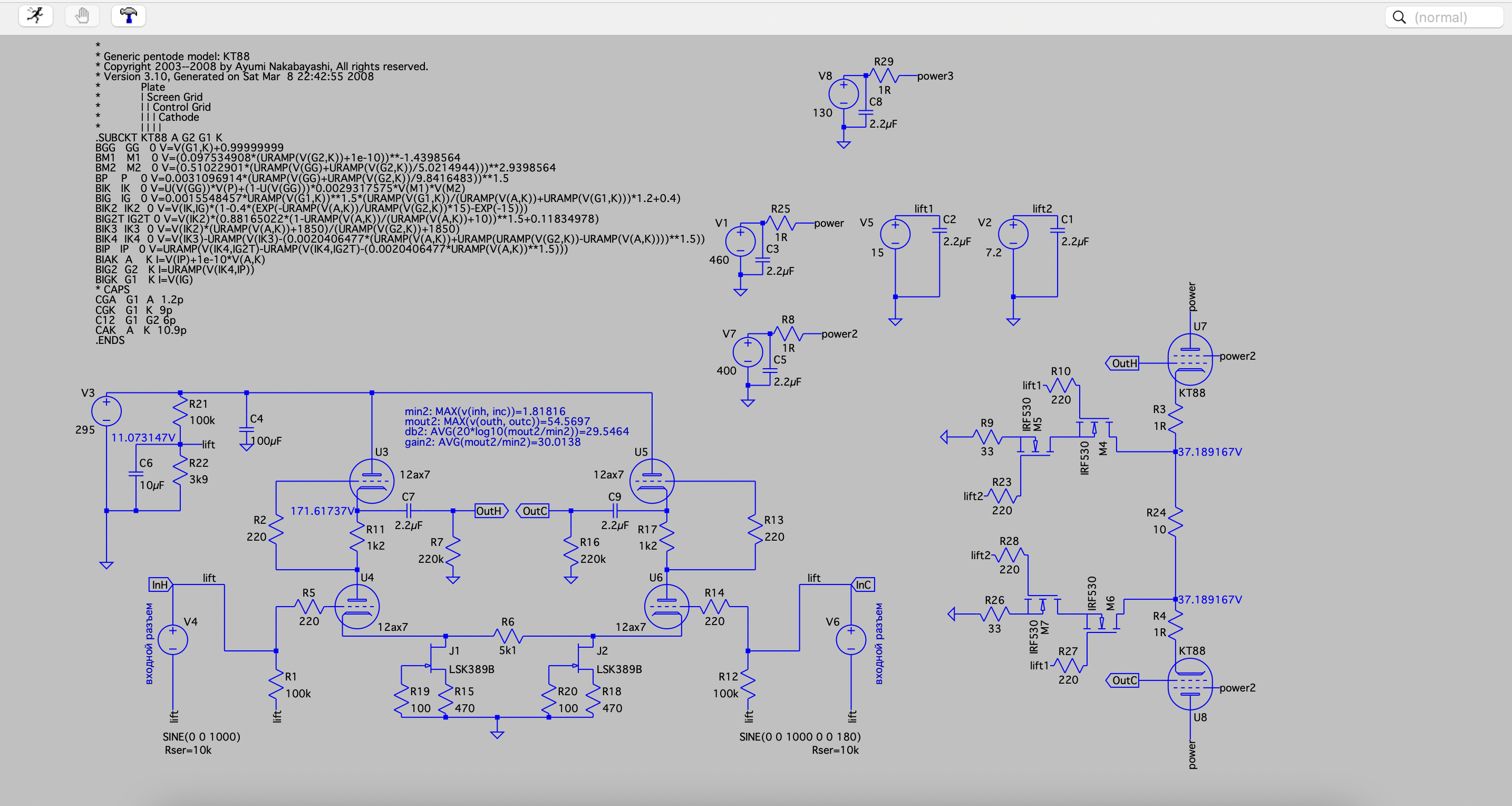 Если подать на сетку КТ88 139В, на катоде будет примерно на 40В больше, допустим, 180В. нам же нужно получить на лампе примерно 400-420В (Ubb=460В - 40В). Получается, что напряжение питания выходного каскада будет достигать 580-600В, что довольно много, учитывая ток. Это также увеличит рассеяние на источниках тока (180*0,1=18Вт на каждом). Поэтому предлагаю рассматривать вариант дополнительного положительного питания, допустим, +130В. Для организации смещений источников тока Uc1=7 и Uc2=15В также нужно предусмотреть свои напряжения. Как конкретно делать это положительное смещение можно рассуждать, сейчас это пусть будет просто отдельное питание. Итак, с учётом драйвера: