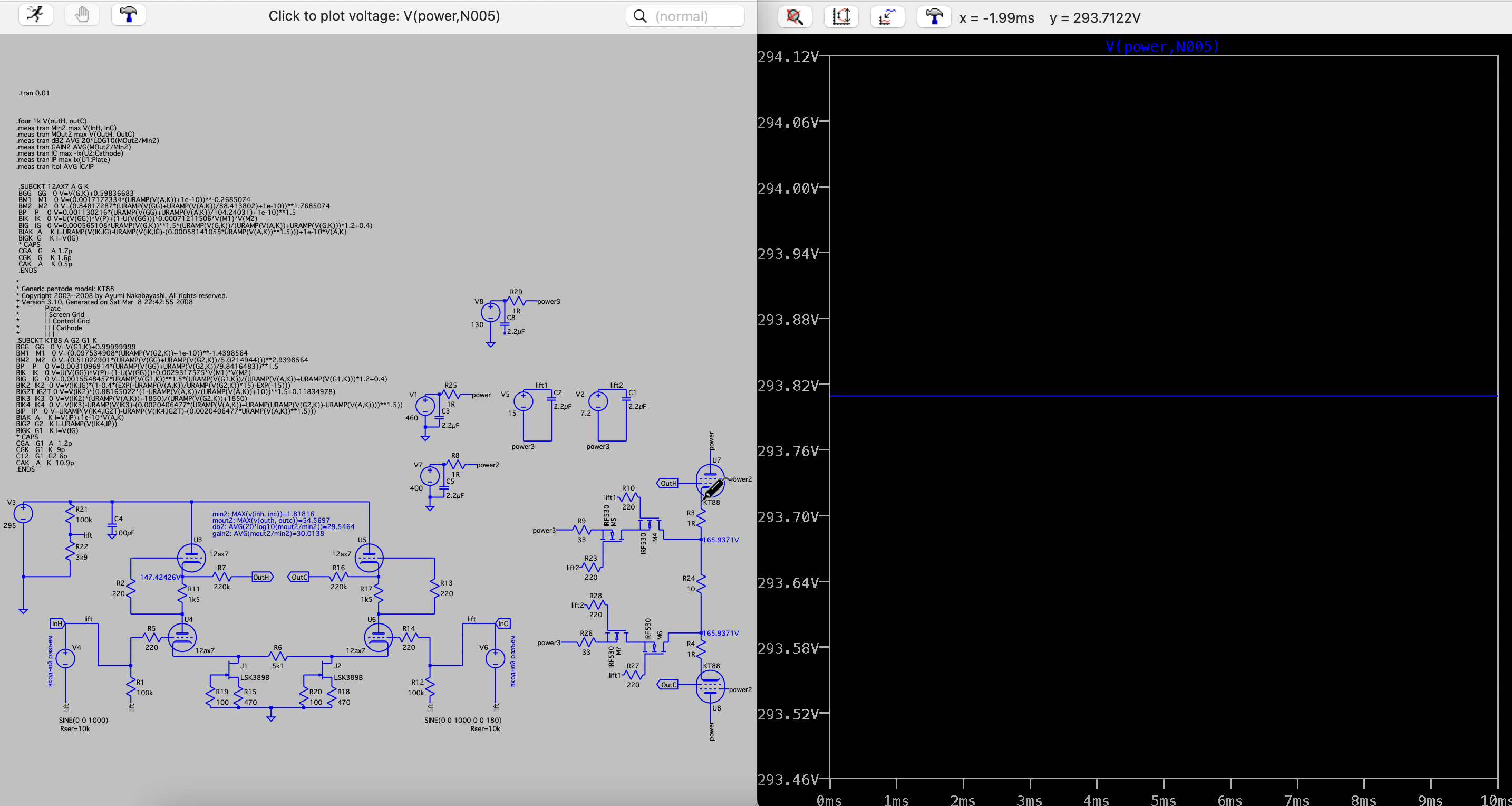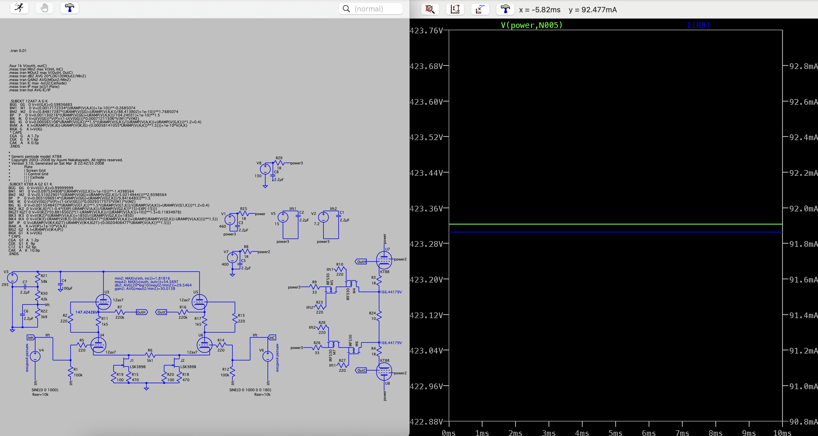 Пока для оценки напряжений я оставил конденсаторы на выходе драйверного каскада, хотел понять распределение напряжений на выходных лампах.